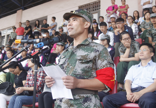 大会会场雄伟壮观,鲜艳的红旗在队前飘扬,雄壮的军歌在空中回荡。“军纪如铁,意志如钢,严格要求,勇争第一”、“激情飞扬,超越梦想、挑战极限、铸就辉煌”等大幅标语悬挂在田径运动场周围,94个排列整齐、精神抖擞的学生方队,迎着朝阳、激情满怀地等待着校领导和九江军分区首长的检阅。校领导甘筱青、吴桃娥、纪岗昌、王万山、陶春元、杨焱林,魏立平、杨耀防、九江军分区政委汪开华大校、九江军分区参谋长封志宏大校、空军场站参谋长张武中校及学校各二级学院党政负责人和有关部门负责人出席了大会。副校长王万山主持了2015级新生军训表彰大会。