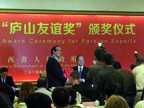 经江西省外国专家“庐山友谊奖”评审委员会评审,并报请江西省人民政府批准,我校美籍华裔教师殷立夫(Philip In)被授予2015年度江西省外国专家“庐山友谊奖”。10月21日,2015年度“庐山友谊奖”颁奖仪式在南昌举行,中共江西省委副书记、省长鹿心社为获奖的外国专家颁奖并致辞,常务副省长毛伟明宣读了省政府授奖决定,仪式由省政府秘书长、办公厅主任张勇主持。