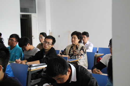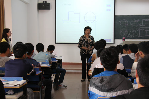 周玉华老师本节课讲解内容是上节课知识——《曲面立体及表面上的点和线》的作业。她对每项作业解答步骤进行了详细、清晰的讲解,同时启发和引导学生思路,令同学们更易于理解。吴桃娥副校长与同学们一起专注听课,并认真地做着听课笔记。