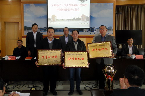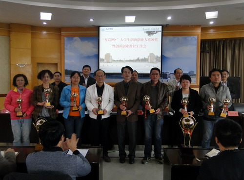 会上,实验中心主任方向明宣读了《九江学院关于公布“互联网+”大学生创新创业大赛校园赛获奖名单的通知》。经个人申报,二级学院推荐,学校组织专家评审,评选出一等奖6个,二等奖10个,三等奖12个,优秀组织奖3个。甘校长、陶副校长和在主席台就座的领导小组办公室负责人向获奖二级学院代表颁发了奖杯和奖牌。