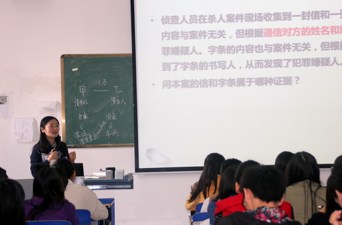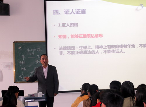 课上,周江老师讲授了“证据种类”一章的内容,具体讲解了三个大问题:第一、物证;第二、书证;第三、视听资料。甘校长与同学们一起全神贯注,认真听讲,课堂气氛良好。