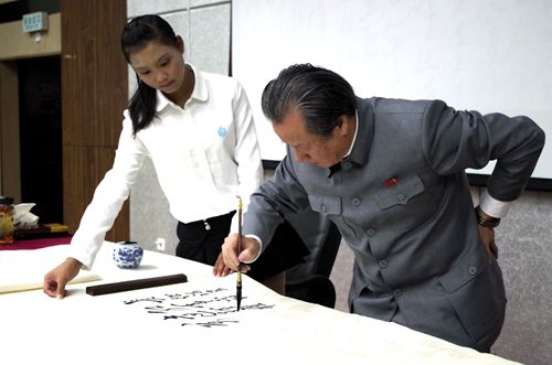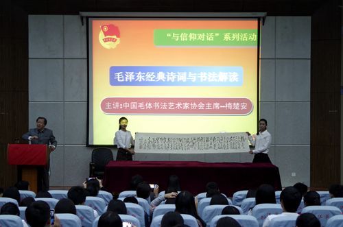 为深入推进“四进四信”活动,贯彻落实一二七计划,11月6日晚,中国毛体书法艺术家协会主席梅楚安做客我校“与信仰对话”专题讲堂,在文友楼报告厅带来题为“毛泽东经典诗词与书法解读”的精彩讲座。讲座前,副校长吴桃娥接见了梅楚安主席。学生处、校团委负责同志及学生代表500余人参加了讲座,讲座由校团委书记闫来英主持。