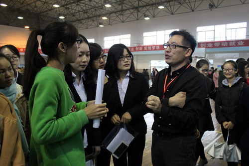 副校长陶春元在招生与就业处领导、外国语学院党政领导班子成员陪同下来到招聘现场,陶副校长详细询问了招聘会情况,并与现场的企业代表、应聘的同学们进行了交流,鼓励同学们要树立信心、积极应聘。罗副处长与参会的优秀校友代表进行了亲切交谈,代表学校邀请校友们经常回学校看看。