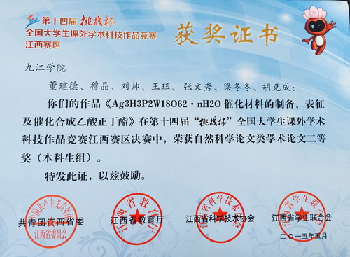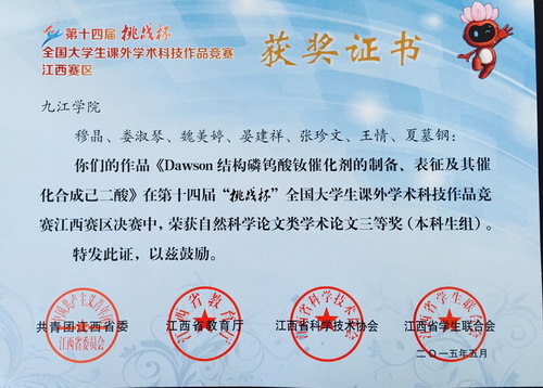 第十四届 “挑战杯”全国大学生课外学术作品竞赛,我院共申报作品5件,在曹小华等老师的指导下,两件作品分别获得江西省挑战杯二等奖和三等奖,也是我院首次获得二等奖,在九江学院申报的同类作品中排名第一。