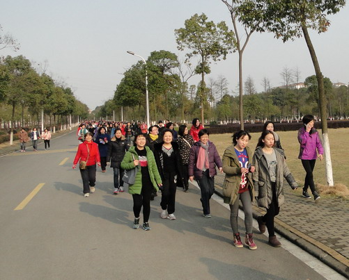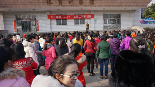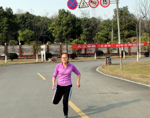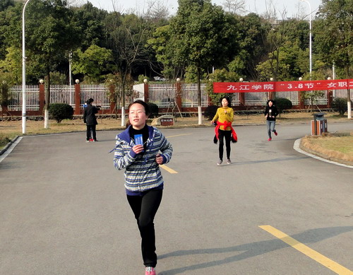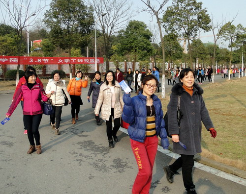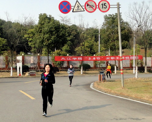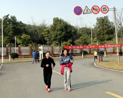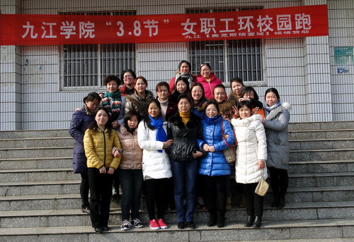一路上,大家精神抖擞,大步向前,整个活动现场气氛热烈,巾帼女英雄们个个积极踊跃,热情参与,充分展示了我校女教职工团结、奋进、自尊、自信、自立、自强的精神风貌。在环校跑队伍中,有一支特别的队伍,她们是离退休女教工,她们精神焕发,健步如飞,风采不减当年,成为一道亮丽的风景线。活动过程中,年长的女教职工和许多女青年教师一起,满怀信心地向目的地跑去。大家自始至终精神抖擞,朝气蓬勃,充分展现了九江学院人奋发向上、团结一致的精神。虽然气温较低,寒气袭人,但是广大女教职工们在这个属于自己的节日里,参与活动的热情丝毫不减,她们一路欢声笑语,一直坚持到了环跑线路的终点。