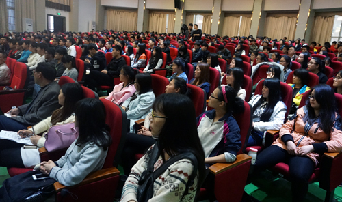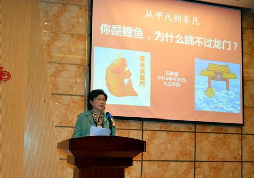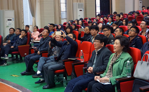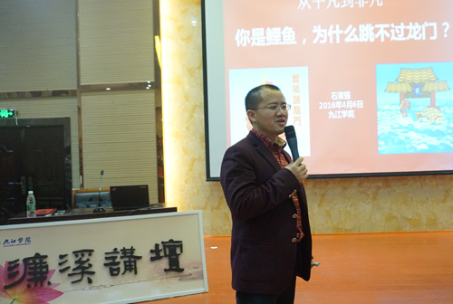 4月6日下午,我校优秀校友、锦坤文化发展集团创始人、连锁与互联网品牌营销专家石章强做客我校第143期“濂溪讲坛”, 分别在八里湖校区报告厅和主校区香远楼三楼报告厅为我校师生带来了两场题为“从平凡到非凡:你是鲤鱼,为什么跳不过龙门?”的精彩讲座。讲座由副校长吴桃娥主持。副校长王万山与广大师生们一起聆听了讲座。