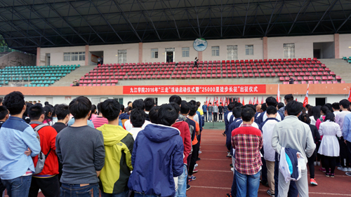 启动仪式上,举行了“出征”授旗仪式。副校长王万山宣布——九江学院2016年三走活动启动暨两万五千里徒步长征正式出征!