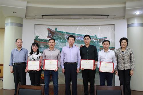 副校长吴桃娥代表学校为刘鹏飞、刘伯、唐正荣和姜洪峰颁发了首批九江学院创业导师聘书并合影留恋。