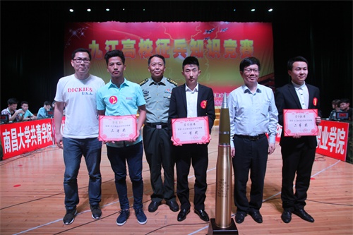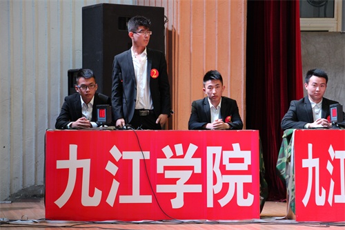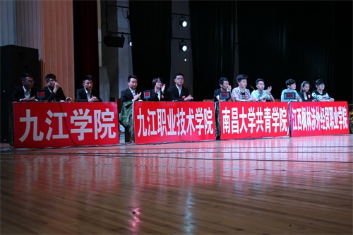 此次知识竞赛共有来自九江地区7所高校代表队的21名选手参加决赛的角逐。他们分别是:九江学院代表队,九江职业大学代表队,九江职业技术学院代表队,江西财经职业学院代表队,南昌大学共青学院代表队,共青科技职业学院代表队,江西枫林涉外经贸职业学院代表队。先后经过必答题、抢答题、速答题和风险题四个环节,各个代表队参赛选手的优秀表现赢得了观众们热烈的掌声。经过激烈的角逐,由我校外国语学院孙文彪、赵文菖、谢昌文三名同学组成的九江学院代表队勇夺本次竞赛冠军,孙文彪同学凭借优异的表现获得最佳答辩手光荣称号。