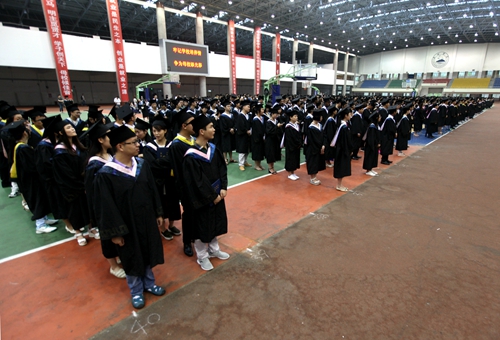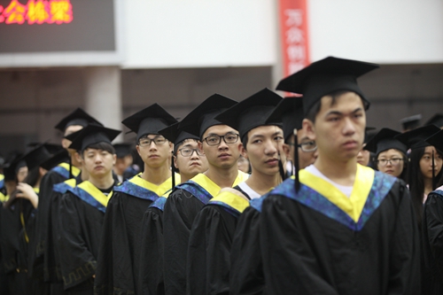 典礼现场,毕业生们统一身着学士服,庄严肃穆。田径馆电子屏幕上“热烈欢送2016届毕业生奔赴祖国各地” 、“牢记学校培养情,争为母校添光彩”、“今日桃李芬芳,明日国家栋梁”表达了学校对毕业生生的殷切希望。毕业典礼暨学位授予仪式在雄壮的国歌声中开始。