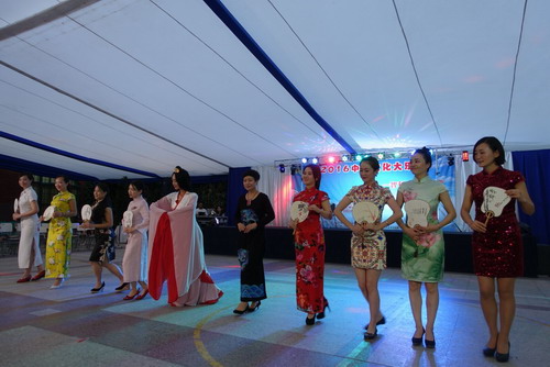 随后,江西教师代表团的各位教师依次给大家带来了武术、舞蹈、书画、剪纸、琵琶弹奏、豫剧、魔术表演、古诗吟诵、茶艺和集体歌伴舞等形式多样、内容丰富的演出节目,给大家呈现了一场高雅的中国传统文化魅力的视听盛宴,其中既有身手不凡的武术表演,巾帼不让须眉的风采展现的淋漓尽致;也有婀娜灵动的民族舞蹈表演、把江南女子的柔美娇羞呈现的惟妙惟肖;还有精彩的书画剪纸和琵琶弹奏合演,让大家在短时间内一睹了中国古典琴棋书画艺术的高雅情趣及魅力;一个个神奇的魔术表演让场下的观众们连连称赞;一曲《霓裳古韵》吟诵及旗袍秀展示仿佛带大家穿越到了“青青子衿,悠悠我心”的古风年代,各位女教师成员身着古典旗袍,手持蒲扇,吟吟细语,把中国女性特有的柔美和端庄展现的异常生动;最后一曲集体歌伴舞《爱我中华》把全场气氛拉向高潮,教师们纷纷把台下的观众请上舞台一起踏着欢快的旋律跃动起来,这种互动顿时带动了全场,现场一片喜气祥和。