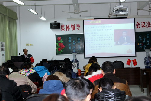 宣讲会上,王教授主要从以下四个成果展开宣讲解读十八届六中全会精神:一是政治成果:明确了习近平同志的核心地位;二是理论成果:专题研究了全面从严治党,使 “四个全面”得到系统部署;三是制度成果:制定了《准则》,修订了《条例》;四是工作共识:明确了十九大召开时间,部署了下半年经济工作重点。与会人员被王教授丰富的学识,严谨的逻辑思维,深入浅出的说理所感染,会场不时爆出掌声。