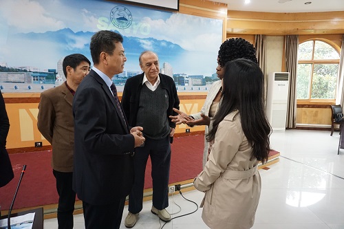 会后,访问团成员一行在副校长杨耀防的陪同下前往校园新区青衿园、五柳湖等地参观,杨副校长耐心地为访问团成员介绍九江学院的校园景观,在白鹿洞书院学规的石碑前,为他们讲述中国古代书院的教育方针,“博学之,审问之,慎思之,明辨之,笃行之”,访华团成员被九江学院优美的校园风光所深深吸引。
