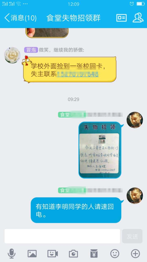 经过准确的信息描述,有效的信息发布,及时的信息传递,通过后勤交流平台群的互相转发与核实,9:30就及时精准找到了失主。