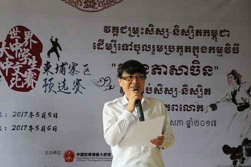 梦想点亮未来,青春绽放色彩。2017年5月5日和6日, 柬埔寨王家研究院孔子学院人头攒动,热闹非凡,2017年“汉语桥”世界大、中学生中文比赛柬埔寨赛区预赛在柬埔寨王家研究院孔子学院二楼大厅隆重举办。本次比赛由中国驻柬埔寨大使馆主办,柬埔寨王家研究院孔子学院承办。正在柬埔寨孔子学院访问的全国人大常委会副委员长、中国妇联主席沈跃跃在中国驻柬大使熊波的陪同下,欣然来到比赛现场,观看比赛。