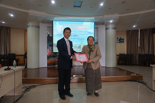 柬埔寨王家研究院院长克洛媞达院士做了热情洋溢的致辞。她说,回顾历史可知道中柬友好交往可追溯到两千年以前,在当今两国领导人的共同努力下,双方达成了全面战略合作伙伴关系,促进了两国人民心心相通。接着她对九江学院一直以来对柬埔寨王家研究院的支持与帮助表示感激,并回顾了双方合作建立的柬埔寨王家研究院孔子学院近年来取得的丰硕成果。最后,克洛媞达院士再一次对九江学院领导和师生的热情款待表示感谢。