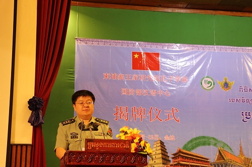 7月12日上午,柬埔寨王家研究院孔子学院柬埔寨国防部汉语中心揭牌仪式在柬埔寨国防部大礼堂隆重举行。柬埔寨国防部副部长晋翁上将(CHEANG Am)、中国驻柬埔寨大使馆武官李宁亚、柬埔寨孔子学院院长谢莫尼勒(H.E.CHEA Munyrith)、中方院长夏修龙及柬埔寨国防部有关官员150余人出席揭牌仪式。