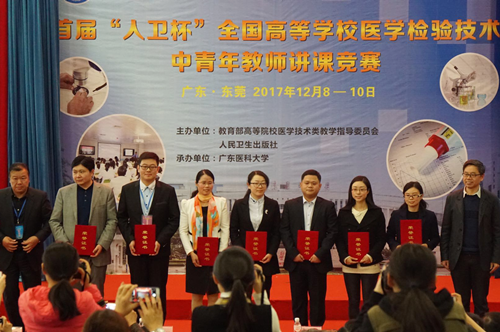 为进一步提升全国高等院校医学检验技术中青年教师的教学能力和业务水平,展示中青年教师教学风采,12月8日至10日,由教育部高等院校医学技术类教学指导委员会和人民卫生出版社共同主办的首届“人卫杯”全国高等院校医学检验技术中青年教师讲课竞赛在广东医科大学东莞校区举行,我校基础医学院病原与免疫教研室龙锴博士、临床医学院/附属医院医学检验教研室韩峰老师参加此次竞赛,两人均荣获二等奖。