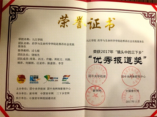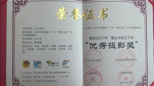 2017年“镜头中的三下乡”活动,是由团中央学校部、团中央网络影视中心指导,中国青年网、新华网联合主办。据悉,共计1200余所大中专院校的10000余支团队提交参赛作品60000余件,覆盖学生数量超过100万人。其中,药生学院2017科技支农服务队(指导老师:过七根)在2017年“镜头中的三下乡”评比中荣获团中央“优秀报道奖”;化环学院科技支农服务队(指导老师:刘小风)在2017年“镜头中的三下乡”评比中荣获团中央“优秀摄影奖”。