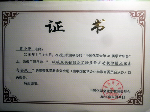 8日上午,在中文核心期刊《化学教育》主编、北京师范大学刘正平教授的主持下,曹小华教授并做了主题为“硫酸亚铁铵制备实验多维互动教学模式探索与实践”的口头报告。报告依次从“提出问题:模式简介及教学现状”、“解决问题:多维互动教学模式实践”、“解决效果:两种模式的比较”三个层面进行讲解,并对课题组主持的省教改重点课题系列相关成果进行了推介。