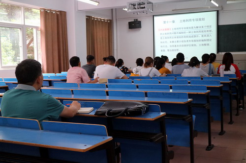6月12日上午8:00-8:45,本科教学工作审核评估专家组成员、信阳师范学院副校长王文臣教授来到竞知楼408教室,听取了旅游学院蔡潇老师讲授的《土地使用规划》课程。