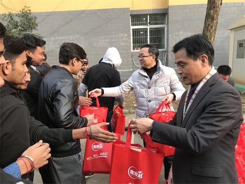 随后,伴随着现场喜气洋洋的音乐气氛,杨副校长为留学生们送上节日慰问品。留学生们深深感受到学校对他们的关心,向领导和老师送上他们的新年祝愿。