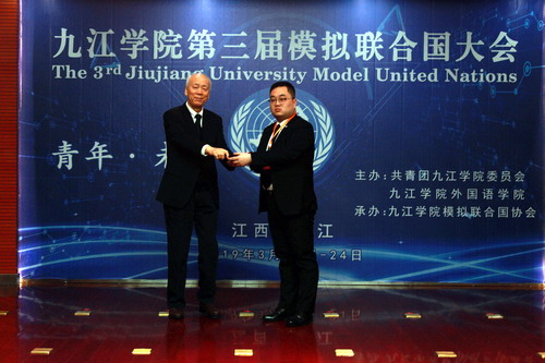 会上,校团委书记闫来英宣读了《关于成立九江学院模拟联合国协会的批复》,学生处处长刘平向模拟联合国协会授旗。大会委员会主席团指导、华中科技大学博士生江冬同学代表主席团致词,我校模联协会会长陈跃同学作表态发言。