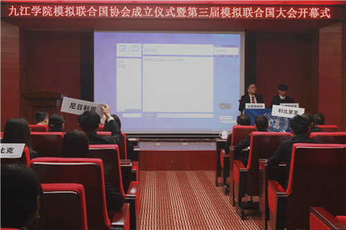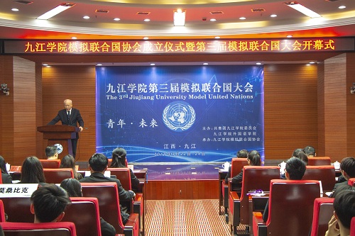 3月22日上午,九江学院模拟联合国协会成立暨第三届模拟联合国大会开幕式在逸夫报告厅举行。校党委副书记魏立平、中国模拟联合国常务理事、资深外交官华黎明大使出席开幕式,本次模联大会以“青年·未来”为主题,有来自华中科技大学、武汉大学、华东交通大学、长沙学院和我校的50名代表参加,学生处、团委、外国语学院负责同志参加了大会。开幕式由校团委副书记任丹阳主持。