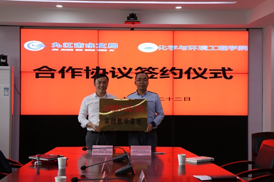 签约仪式上,曹小华副院长和黄良保副局长分别代表双方共同签订了《九江市水文局与九江学院化学与环境工程学院合作框架协议》,同时还举行了实习基地的授牌仪式及兼职教授的聘任仪式。双方表示将本着“优势互补、平等合作、互惠互利、共同发展”的原则,充分发挥市水文局在监测能力、成果转化的优势与化环学院在人才队伍、科研方面的优势,共建平台、共享资源、共同发展。