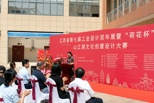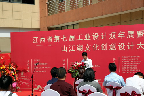 省文联副主席龙红在致辞中说:举办“江西省第七届工业设计双年展暨‘荷花杯’山江湖文化创意设计大赛”,对于激发我省工业设计人士的发明创造热情,提升我省工业设计整体水平,促进文化创意产业与生态经济协调发展具有十分重要的意义。设计产业作为生产性服务产业,在我国经济转型发展过程中发挥着越来越重要的作用。江西省工业设计双年展是我省文艺界的一项重要活动,代表着江西艺术设计界的权威和风向标。江西省第七届工业设计双年展,紧扣“山、江、湖”主题,致力于赣鄱文化及山水文化元素的弘扬与传播,展出作品具有创新性、文化性、纪念性、实用性、环保性、经济性,策应了国家工业创造战略,创新了设计理念,为我省设计创作和艺术学术活动提供了一个良好交流平台,对推动我省工业领域原创设计的繁荣发展,将产生积极而重要的影响。此次展出的优秀作品代表着我省艺术设计创作、教育的最新成果,较好的展示出江西地理特征和地域文化。九江学院作为本次活动的承办方,为本次展览活动的顺利举办付出了辛勤的汗水。通过此次活动,促进了全省艺术单位技艺交流、相互比较,相互发展,共同提高。衷心希望工业设计双年展大赛活动越办越好,并努力促进艺术设计成果转换为实际产品服务社会、服务人民。