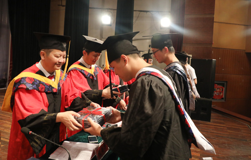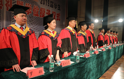 在学位授予仪式上,校党委书记赵伟、校长刘晓东为毕业生代表颁发毕业证书,全体校领导为毕业生代表拨正流苏,祝愿他们前程似锦、展翅高飞。