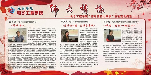 孙小明:是的,我从小一直梦想当一名老师,高考志愿填报的都是师范类院校,因机缘巧合上了军校。这一上军校,就在部队工作了26年。2005年,我转业到地方工作。各种机缘巧合,我来到了九江学院。一晃15年过去。回顾这15年的工作,我很庆幸是在大学里度过的,尤其是其中的12年在电子工程学院。我的工作岗位属于高校基层党务工作者,勉强算作教育管理岗位。严格地说,不算是一名真正意义上的老师。但是,我天天都跟老师和学生在一起,学生见了我也都叫我老师。在这种氛围中,我也自然而然地把自己扮成一个老师的模样,按照老师的方式去思考问题、处理问题。尽可能为老师着想,为老师说话,为老师争取应有的尊重和应得的利益。