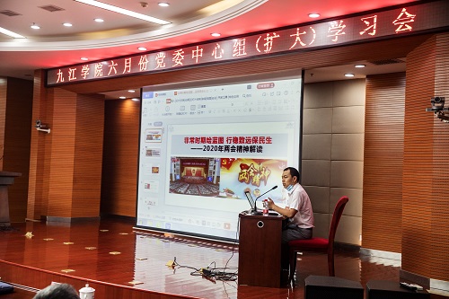 会上,马克思主义学院赵文博士作了题为《非常时期绘蓝图行稳致远保民生》的专题辅导报告。赵博士从2020年两会风采掠影、2020年两会精神要览、2020年两会热点聚焦等方面对两会精神作了详细解读。