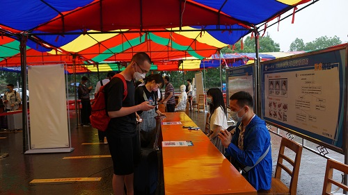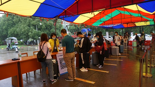绵绵细雨阻挡不了同学们返校复学报到的热情,从各地返校的同学们或由亲友自驾、或乘坐九江学院学生返校公交专线陆续进入学校西大门复学报到专用通道,根据标识牌,在工作人员的引领下,按照间隔线,保持安全距离,排队安全有序地完成体温检测、个人身份核对、健康码查验、扫码报到登记等复学报到程序。当同学们进入校园后,即可乘坐校车回到宿舍。