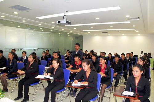 开班仪式结束之后,大家共同观看了王家研究院孔子学院五年来建设发展的历程。来自吴哥高中孔子课堂的教师志愿者及全体吴哥免税店汉语班学员约100余人参加了仪式。