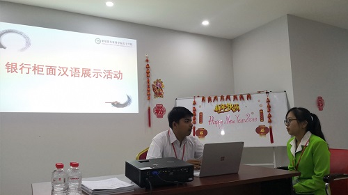 2018年12月29日下午,为检测学员本学期学习成果、体验汉语的文化传播功能、培养学员的汉语交际能力,柬埔寨皇家科学院孔子学院加华集团汉语中心在奥林匹亚城举办了“迎新年,银行柜面服务汉语展示”主题文化活动。由加华集团银行、工程、物流和物业管理等部门的优秀职员组成的加华集团汉语教学中心高级班学员参加了本次活动。