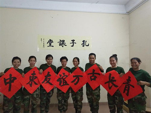 孔子课堂女兵学员与书法作品合影