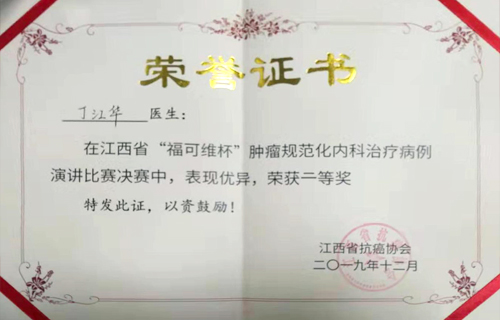 12月8日,由江西省抗癌协会举办的2019年“福可维杯”江西省肿瘤内科规范治疗病例演讲比赛在南昌举办。临床医学院/附属医院肿瘤科丁江华博士代表医院参加竞赛,并取得全省第二名的好成绩。