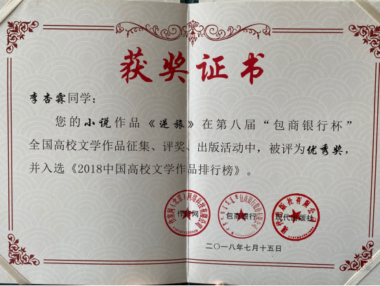 谈起自己获得的荣誉,李杏霖说:“学校丰富的图书馆馆藏资源让我阅读到许多优秀作家学者的作品,文传学院的老师们也给了我创作上的支持和鼓励,优美的校园环境和庐山的山水给了我心灵上的滋养,这些是我灵感的来源。”