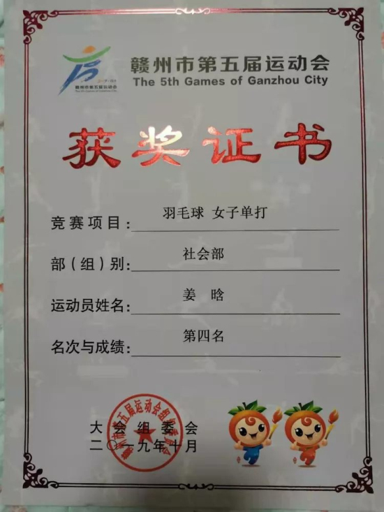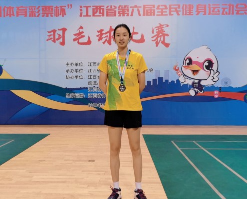 近日,“中国体育彩票杯”江西省第六届全民健身运动会羽毛球比赛在鹰潭市体育馆开赛。据了解,本次比赛为期三天,来自全省11个设区市、县(市、区)的代表队共220名运动员参赛,我校文传学院语文教育专业B1921班姜晗同学参加了女子单打比赛,经过奋力角逐进入四强,获得了二等奖的好成绩。