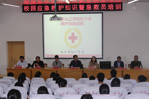 为了更广泛地在校园内开展和普及应急救护知识与技能培训工作,切实提高我校师生的安全防范意识、防灾避险和自救互救能力,11月11日下午,在学生处、团委、保卫处、综治办等部门的支持与配合下,由校医院与九江市红十字会联合组织的“校园应急救护知识暨急救员培训班”开班了。杨耀防副校长、九江市红十字会专职副会长赵绍红、九江市红十字会救护培训中心、校综治办、学生处、校医院相关人员参加了开班仪式。