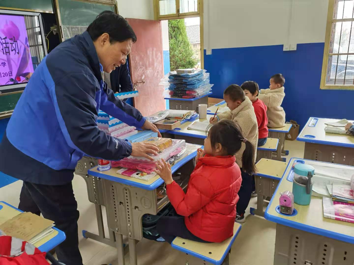 校工会为同学们一一发放了爱心书包,在发放爱心书包的同时,还询问了同学们的学习及生活情况,并嘱咐同学们要好好学习,天天向上。