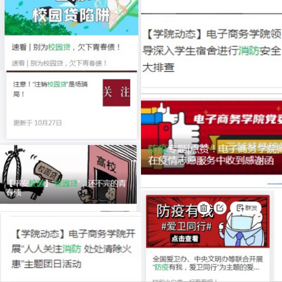 电商学院坚持利用线上线下相结合的宣传方式,在做好线下安全教育工作的同时,官方微信公众号“九江学院电子商务学院团委”不定期推出相关文章,旨在充分利用新媒体的即时性、趣味性等优势,用图文并茂、大家喜闻乐见的形式向全体学生宣传教育,增强安全意识。