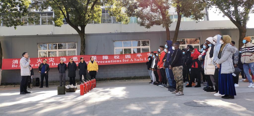 为了增强留学生的消防安全意识,掌握消防安全基本知识技能,1月14日下午,我校国际交流学院在留学生宿舍外广场举行了以 “消除火灾隐患,保障校园平安”为主题的消防安全教育活动。我校保卫处、学生处相关负责人以及国际交流学院全体教师和在校留学生参加了活动。