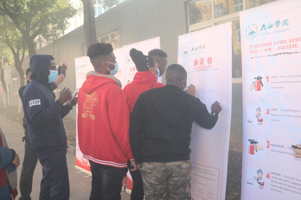 校保卫处消防科黄振华老师为留学生作了消防安全知识和火灾预防的宣讲,他介绍了火灾的基本知识、火灾的危害、火灾扑救和逃生常识,演示了灭火器和消防栓的使用方法。在场留学生进行了灭火器和消防栓的使用操作,在消防安全承诺书上签名,郑重承诺用实际行动,杜绝消防隐患,创建平安校园。