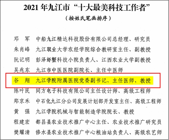 近日,中共九江市委人才工作领导小组办公室、九江市科学技术局、共青团九江市委、九江市科学技术协会联合下发了《关于选树2021年九江市“十大最美科技工作者”、“十大最美青年科技工作者”、“十大最美科普工作者”的行决定》,附属医院党委副书记谷翔教授获2021年九江市“十大最美科技工作者”、该院神经内科柴竞艳医师获九江市“十大最美科普工作者”荣誉称号,附属医院成为本届唯一收获两项殊荣的医疗系统单位。