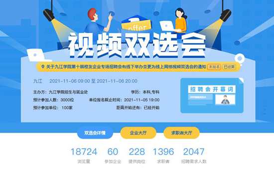 本次招聘会共有来自上海、广州、深圳、义乌、宁波、东莞、杭州、中山、南昌、九江等地的校友企业60家,招聘岗位228个,招聘人数2407名,涉及我校21个二级学院的相关专业。据统计,在此次线上招聘会中,我校2022届毕业生有效点击浏览18724人次,有效简历投递1413人,视频面试279人,最终达成就业意向的毕业生403人。