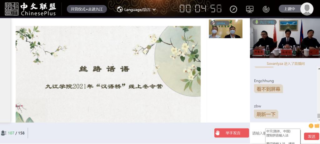 开营仪式后,文传学院何春根博士作了《走进九江》的精彩讲座。据了解,在接下来的9天里,23位老师与学员们将以“云上课”的方式,开启对瓷器、茶叶的探秘之旅,了解汉语诵读的技巧和美感,感受丰富多彩的中国语言与文化。