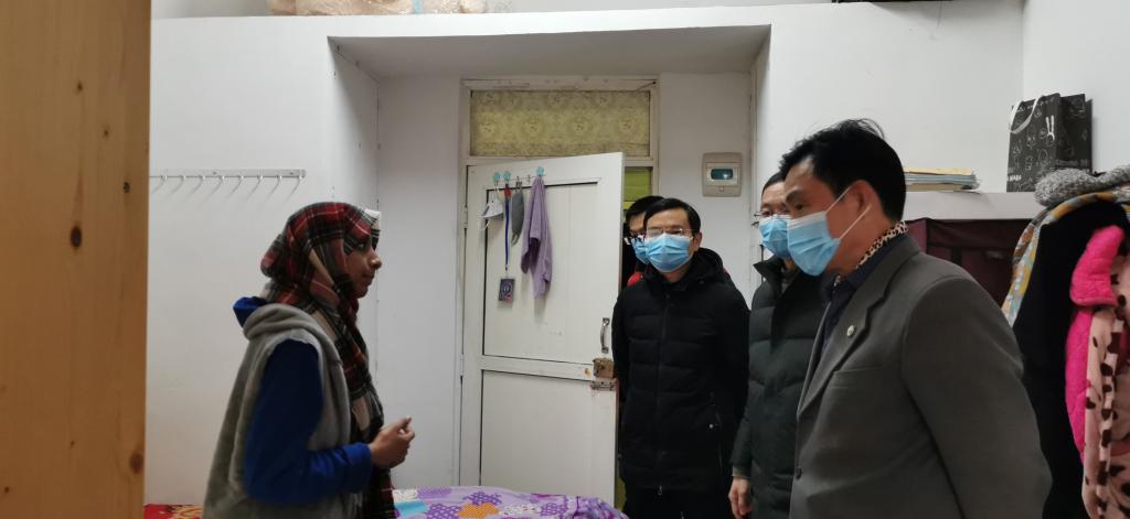 在宿舍楼一楼,杨耀防和学生代表进行了交流,询问了他们在假期的学习安排、饮食安排等,并嘱咐学院出面帮助学生解决寒假期间学生的饮食问题。随后,他去宿舍看望了同学们,询问学生们的饮食、生活、学习情况和寒假计划,并嘱咐他们注意安全,在宿舍不要使用危险电器,要保持宿舍清洁卫生,每天要做适度的体育锻炼,利用寒假学习汉语和医学专业知识,并多与家人保持密切联系。