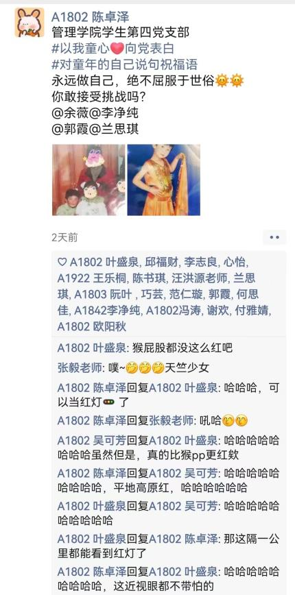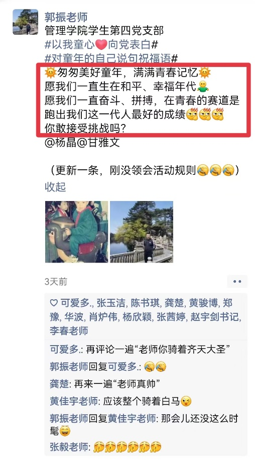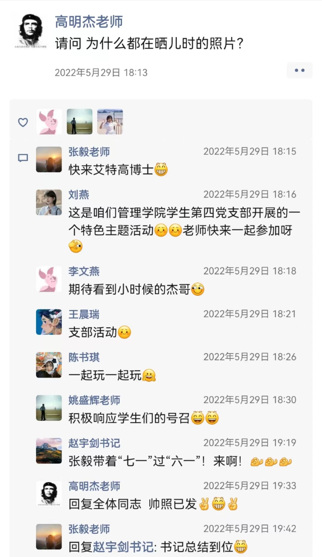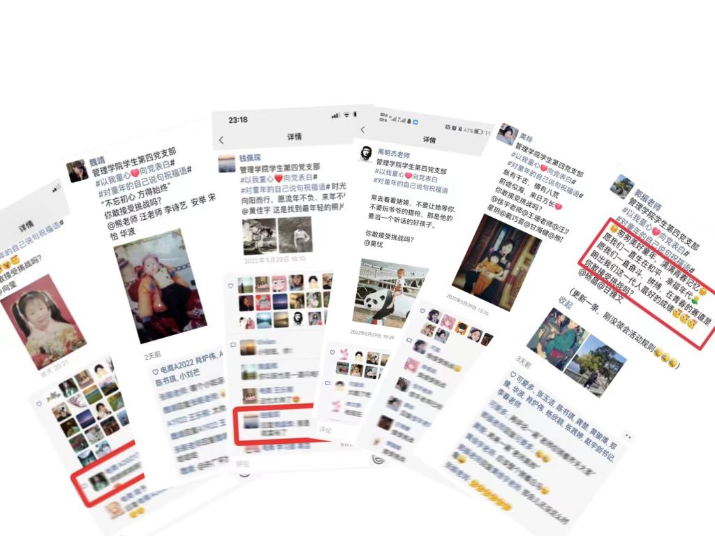 童年初心,时光如梭。分享童年的纯真、快乐,观照当下不忘初心、砥砺前行。整个活动在朋友圈进行,由管理学院学生第四党支部支委发起,分享童年照片和祝福语,并@支部内外师生。被@到的党员群众积极参与,热情点赞、评论、转发,再@传播给更多人。不少人在童年照片下留言,一时间朋友圈气氛热烈、正能量“满屏”。